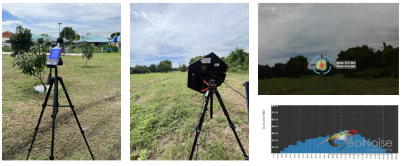 เพื่อตรวจสอบและยืนยันตำแหน่งแหล่งกำเนิดเสียงที่แท้จริง (Noise Source Localization) ทีมวิศวกรได้นำเทคโนโลยีกล้องตรวจจับเสียงแบบ Array Beamforming หรือ Acoustic Camera มาใช้ ซึ่งสามารถแสดงภาพตำแหน่งเสียงควบคู่กับข้อมูลความถี่ได้อย่างแม่นยำ