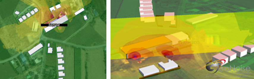 นอกจากนี้ จากการสำรวจแหล่งกำเนิดเสียงภายในโรงงาน วิศวกรของ Geonoise ยังได้ดำเนินการสร้างแบบจำลองทางคณิตศาสตร์ของการแพร่กระจายเสียงด้วยซอฟต์แวร์เชิงอะคูสติก SoundPLAN เพื่อประเมินการกระจายตัวของระดับเสียงจากโรงงานไปยังบริเวณชุมชนโดยรอบ โดยแบบจำลองนี้สามารถระบุพื้นที่ที่อาจมีความเสี่ยงต่อการถูกร้องเรียนในอนาคตได้อย่างชัดเจน