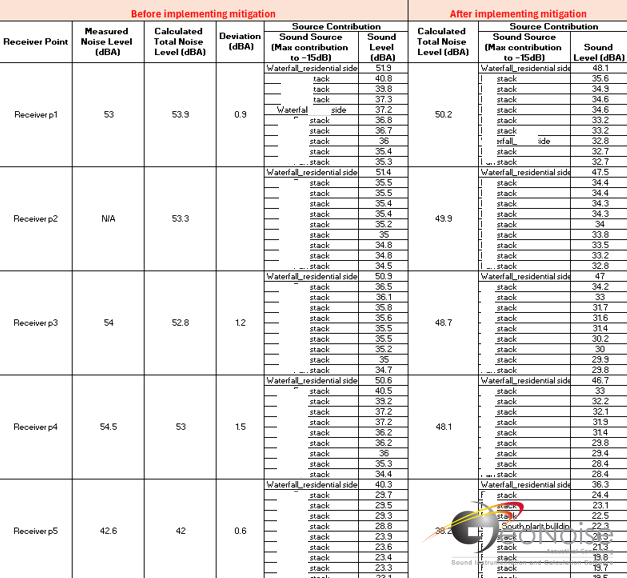 - ระดับเสียงรบกวนในชุมชน จากเดิมที่มีการรบกวนประมาณ 14 dBA ซึ่งมาตรฐานต้องไม่เกิน 10dBA คำนวณโดยนำเสียงขณะมีการรบกวนลบด้วยระดับเสียงพื้นฐาน L90 และระดับเสียงลดลงจนใกล้เคียงกับระดับเสียงพื้นฐาน (Background Noise) ส่งผลให้ไม่เกิดการรับรู้การรบกวนจากกิจกรรมของโรงงานอีกต่อไป